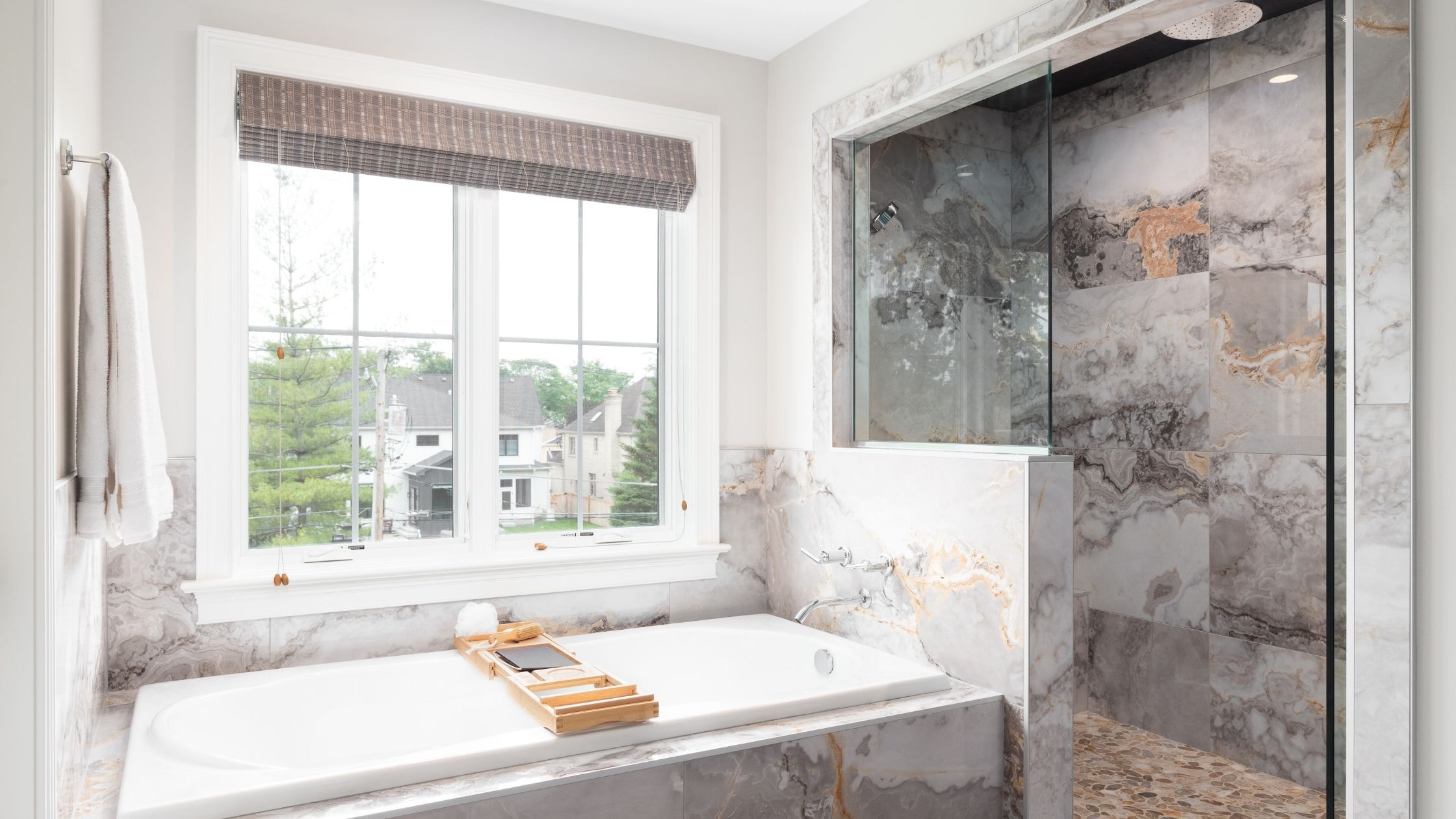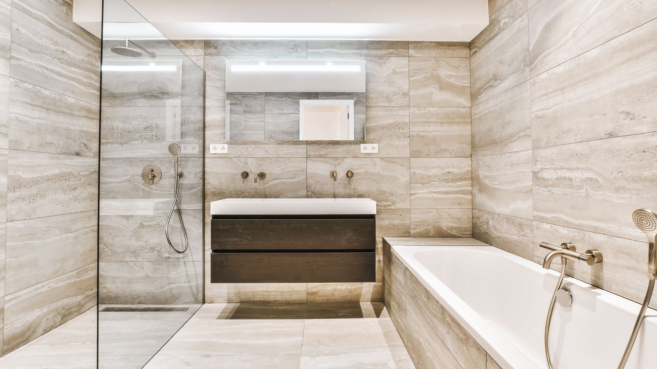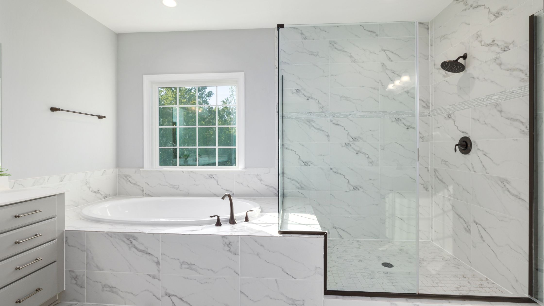 Large-format tiles reduce grout lines for streamlined bathroom floor and wall surfaces. The expansive tiles create continuity that enhances modern bathroom aesthetics.